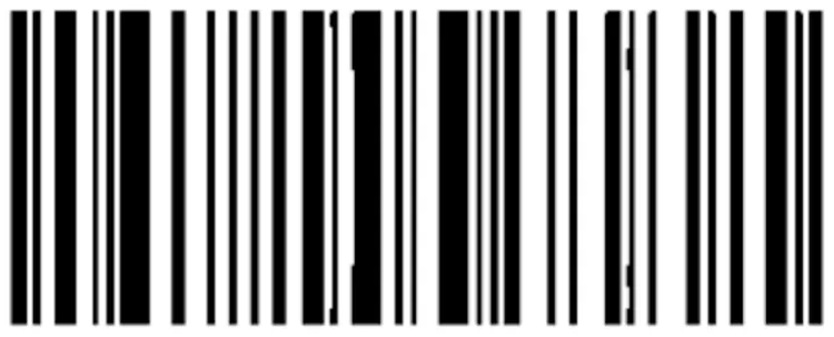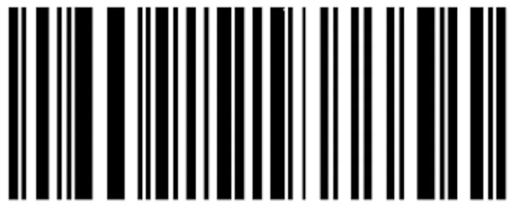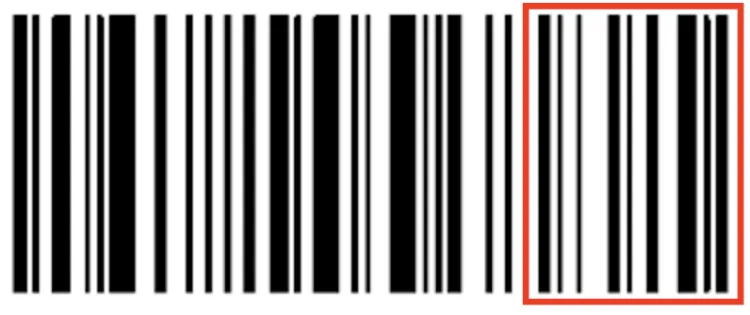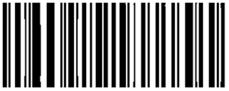 이렇게 산출된 블록별 임곗값은 이후 주변 5×5 블록들의 임곗값과 다시 한번 평균을 내는 일종의 평탄화 과정을 거칩니다. 아마 여기에서 문제가 생겼을 거라고 추정합니다. 기존에 모바일 화면을 캡처한 이미지처럼 단순 흰 배경만 존재하는 경우에는 블록 내 픽셀들의 대비가 부족하므로(255 / 2)가 임곗값이 될 텐데, 적당하게 대비되는 노란색 테두리가 더해지면서 평균값을 임곗값으로 사용하게 되었을 가능성이 있습니다. 이미지에 더해진 노란색 테두리 영역이 꽤나 넓기 때문에 전체적인 임곗값을 끌어올리기에는 충분했을 것이고, 그러면 이진화에 사용되는 최종 임곗값 역시 위로 끌려올라가게 됩니다. 테스트에 사용된 JPEG 이미지의 바코드를 확대하면 바코드 막대의 가장자리 픽셀들이 회색으로 연하게 번져있는 모습을 볼 수 있습니다. 높아진 임곗값으로 인해 이 부분이 이진화 과정에서 흰색으로 변환되어 바코드 막대가 얇아지는 등의 문제가 발생했다는 것이 제 추정의 결론입니다. 실제로, HybridBinarizer로 이진화된 이미지를 직접 그려보면 아래와 같이 몇몇 바코드 막대의 두께가 원본보다 얇아진 모습을 볼 수 있습니다. 즉, 이는 바코드의 일부분이 유실된 것으로, 결국 기존 바코드와 흑백 비율이 달라져 에러가 발생한 것으로 추정해볼 수 있겠습니다.