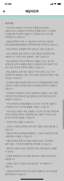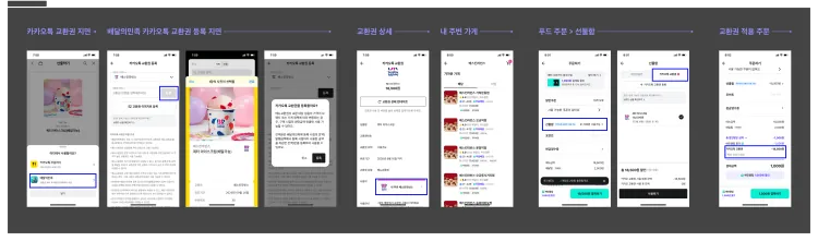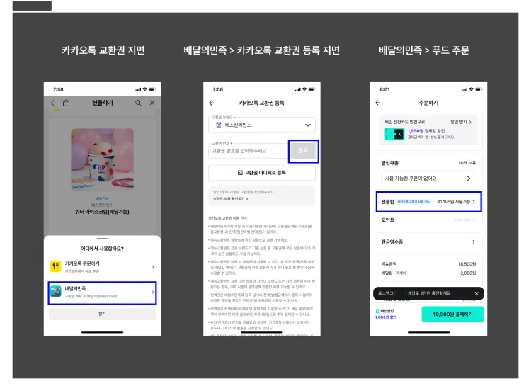 위 이미지를 보시면 이 기능을 사용하기 위해 배민앱에서 고객이 실제로 거쳐야 하는 단계는 생각보다 많습니다. 카카오톡 선물함에서 교환권을 확인하고, 배민 앱에 교환권을 등록한 뒤, 주문할 때 사용하는 흐름입니다. 기획자나 내부 구성원에게는 자연스러운 과정이지만, 고객 입장에서는 한 번쯤 멈칫할 수 있는 지점이기도 했습니다.