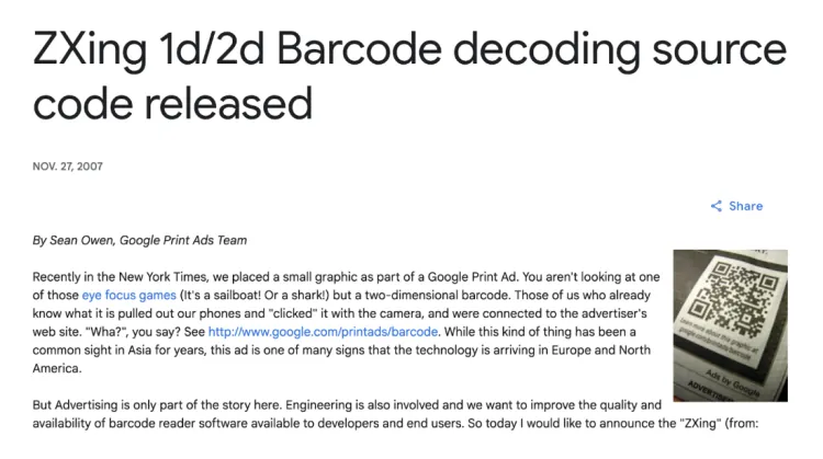 우선, 기능 구현을 위해서는 웹 환경에서 바코드 이미지를 인식할 수 있어야 하는데, 짧은 검토를 거친 결과 JavaScript 기반의 바코드 인식 라이브러리인 zxing.js를 사용하는 것이 좋겠다고 판단했습니다. ZXing(Zebra Crossing)은 2007년에 Google 소속 엔지니어인 Sean Owen이 시작한 오픈소스 바코드 디코딩 라이브러리입니다. Google의 인쇄 광고 팀 내부 프로젝트로 시작되어 안드로이드 진영에서 꾸준히 사랑받아 온 만큼, 라이브러리의 신뢰도 측면에서는 더할 나위 없이 좋은 선택이었습니다. 참고로, zxing.js는 ZXing을 JavaScript 환경에서 사용할 수 있도록 포팅한 구현체입니다. 이 라이브러리를 활용하면 다양한 바코드를 디코딩할 수 있는데, 이 글에서는 카카오톡 교환권에 포함된 1차원 바코드로 내용을 한정하도록 하겠습니다.