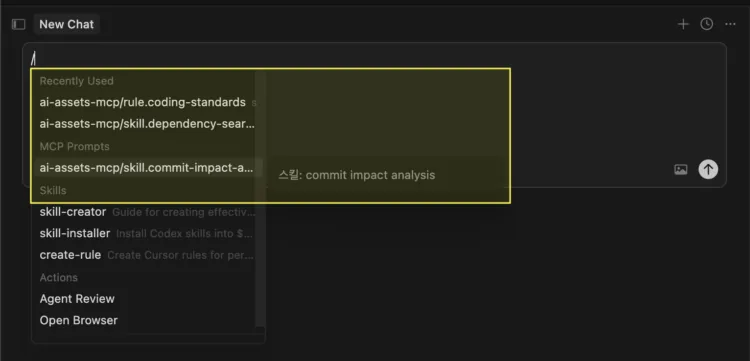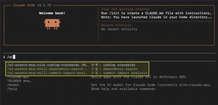 개발자는 평소처럼 / 커맨드를 사용하여 에이전트에게 요청하면 됩니다. 에이전트를 통해 연결된 AI 자산의 목록을 확인하거나, 코드베이스에서 도구를 실행할 수 있습니다. 정상적으로 연동되었다면 아래 스크린샷처럼 각 도구에서 AI 자산을 확인할 수 있습니다.