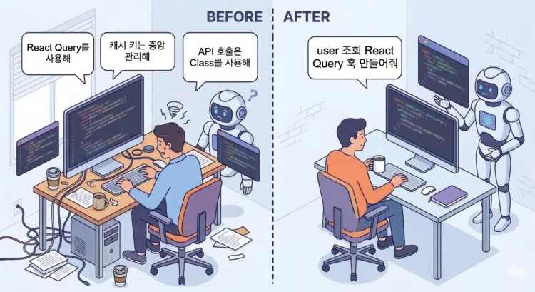 예를 들어 “user 조회 React Query 훅 만들어줘”라고 요청하면, 규칙을 모르는 AI는 공식 문서에 나올 법한 기초적인 형태로 코드를 짜줍니다. 결국 원하는 코드를 얻기 위해 매번 이런 설명을 덧붙여야 했습니다.